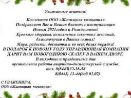 Поздравляем с Новым Годом! Коллектив ООО «Жилищная компания»Поздравляет Вас и Ваших близких с наступающим Новым 2021годом и Рождеством! Читать полностью...